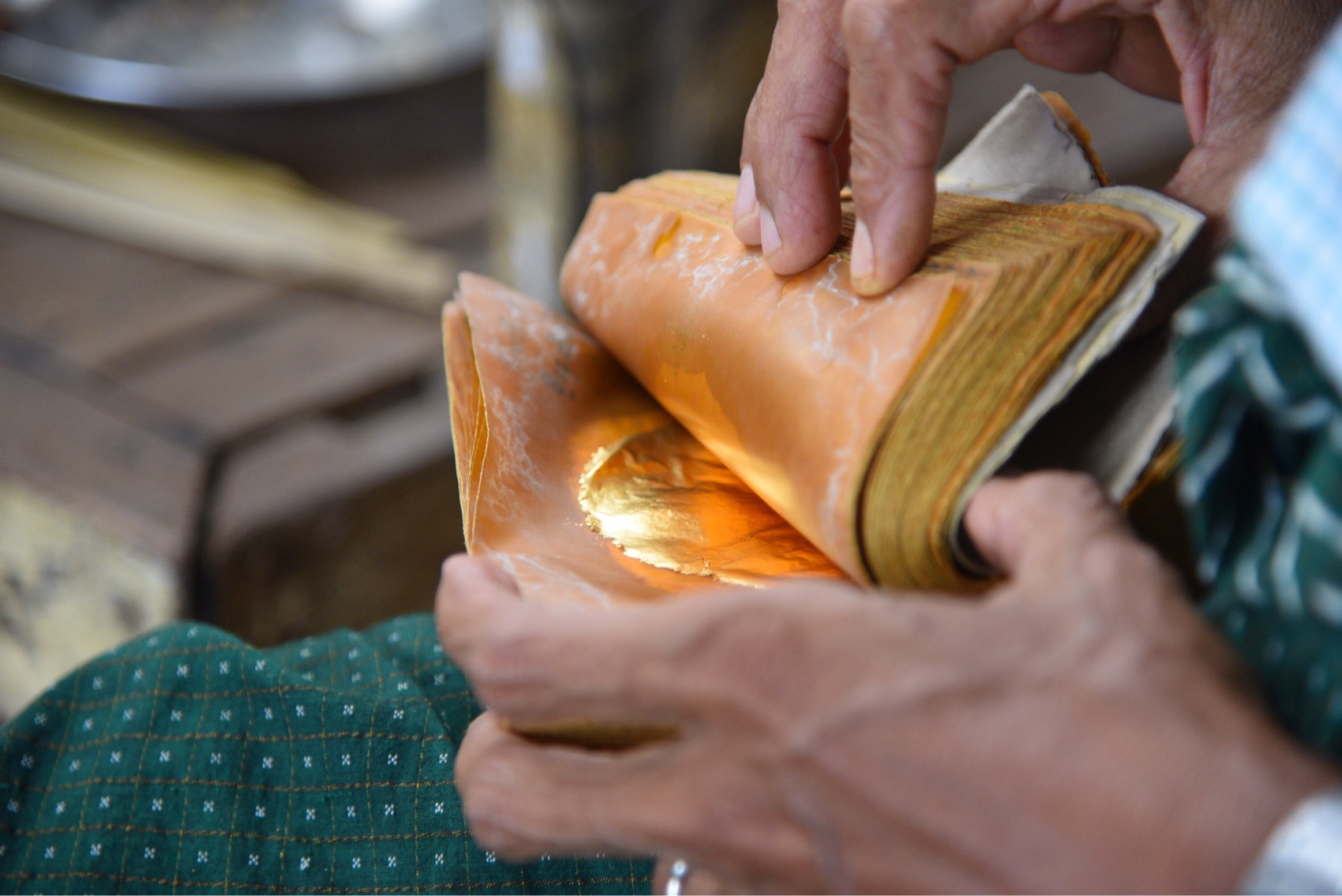 Danach ist man einfach nur noch sprachlos, wieviel Aufwand es bedarf solch ein Blätchen herzustellen. Es ist nicht nur die pure menschliche Kraft die notwendig ist diese Goldblättchen herzustellen, sondern auch der Aufwand der notwendig ist, dass dafür notwendige Bambuspapier herzustellen. Bambuspapier? Für die Herstellung müssen Bambusfaser 3 Jahre eingelegt werden, bis mit der Papierherstellung begonnen werden kann. So verwundert es nicht, dass Sie Papierherstellung teurer ist als die Goldblattherstellung. Zwischen diesen Seiten werden 200 gleichgrosse Goldstreifen geleget. Diese Packet wird dann als ganzenes für 30 Minuten mit einem schweren Hammer bearbeitert. Jeder Arbeiter startet vor dem ersten Hammerschlag eine Zeituhr, da diese körperlich sehr stengende Zeit nur für 3 Minuten durchgehalten werden kann, dann erfolget eine kurze Pause. Insgesamt sind jedoch 30 Minuten notwendig, die feinen Goldblättchen herzustellen. Die Haltung dabei sieht nicht sehr komfortabel aus. Nach etwa 3 Schlägen vergewissert sich der Handwerker, dass der Hammer immer noch zentriert im Landeanflug auf das Päckchen mit den Goldstreifen ist. Nach dem Ende dieser sehr schweißtreibenden und körperlich sehr strengenden Arbeit wird nachgeschaut, ob aus dem Goldband auch Goldblättchen in der richtigen Stärke geworden sind.