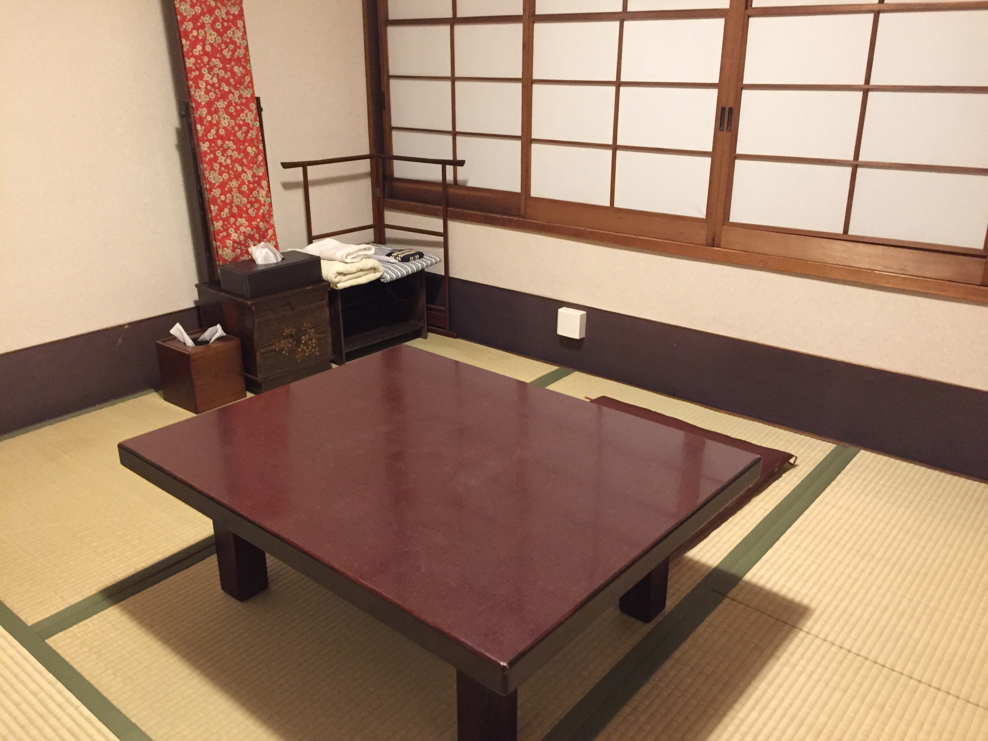 Übernachtung in einem Ryokan. Ein Ryokan ist eine traditionelle japanische Herberge, wo auf einen Futon geschlafen wird. Die leichte Schiebetür zu meinem Zimmer ist niedrig, so dass ich meine Kopf einziehen muss beim Durchgehen. Ganz traditionell kleidet man sich hier in eine Yukata.